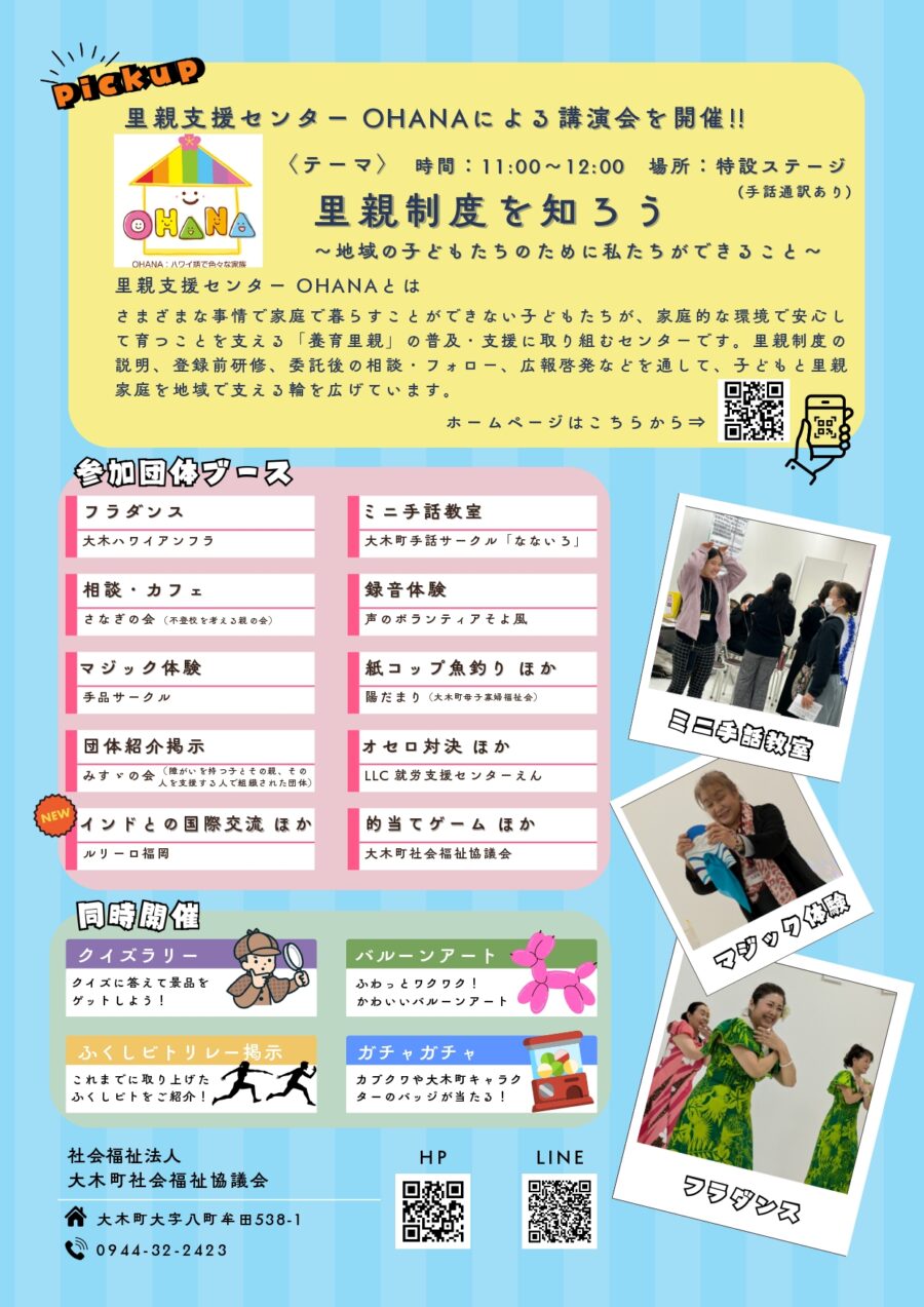 2/28(土)イオン大木店で開催される、福祉フェスタに参加させていただきます。当日は11時から特設ステージにて、里親制度についての講演会をさせていただきます。実際に里親をしている方とのトークセッションもありますので、興味のある方はぜひお越しください♪